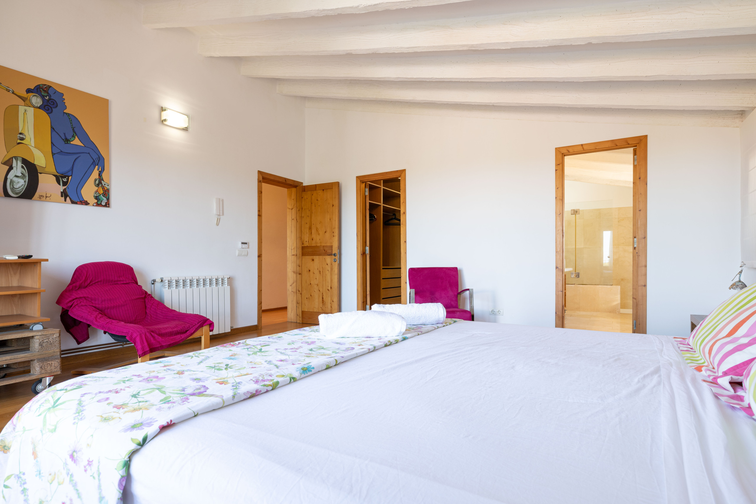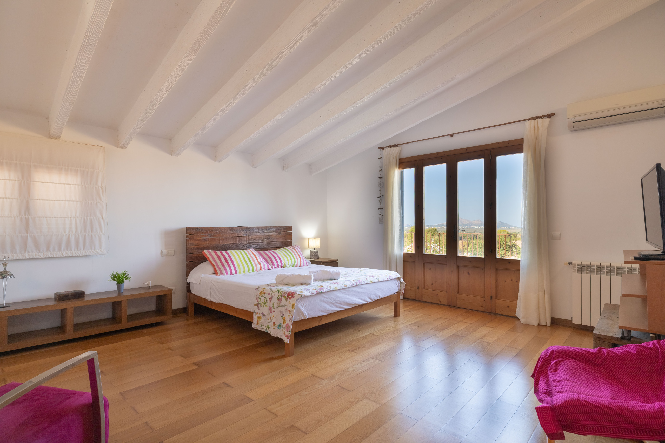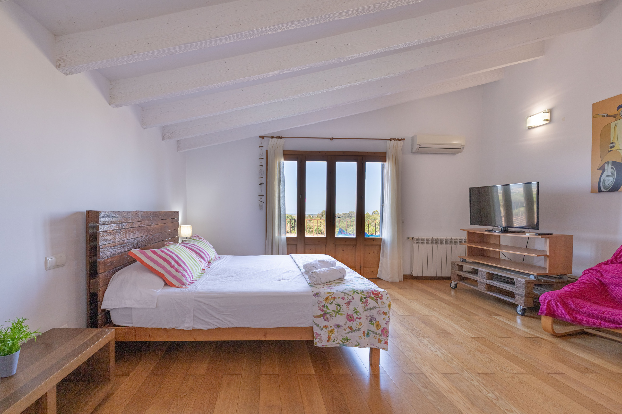 Con vistas al mar Balear, la casa de vacaciones Es Fiters en Muro es perfecta para unas vacaciones relajantes. La propiedad de dos plantas consta de una sala de estar, una cocina bien equipada, cuatro dormitorios y cuatro baños, por lo que puede alojar hasta ocho personas. Los servicios adicionales incluyen Wi-Fi, televisión, aire acondicionado en los dormitorios, lavadora y secadora. También hay una cuna disponible para los huéspedes que la necesiten. El establecimiento ofrece un espacio privado al aire libre que incluye piscina, terraza descubierta, terraza cubierta, balcón y zona de barbacoa. Entre los lugares recomendados para visitar se encuentran la playa de Muro y el Parque Natural de la Albufera. Hay cuatro plazas de aparcamiento disponibles en la propiedad. Se permite un máximo de dos mascotas. No se permite fumar ni celebrar eventos. Esta propiedad cuenta con directrices para ayudar a los huéspedes con la correcta separación de residuos. Además, dispone de características para el ahorro de luz y agua. Parte de la electricidad de la propiedad se genera mediante paneles fotovoltaicos y se han utilizado materiales sostenibles en su aislamiento. Número máximo de mascotas: 2.