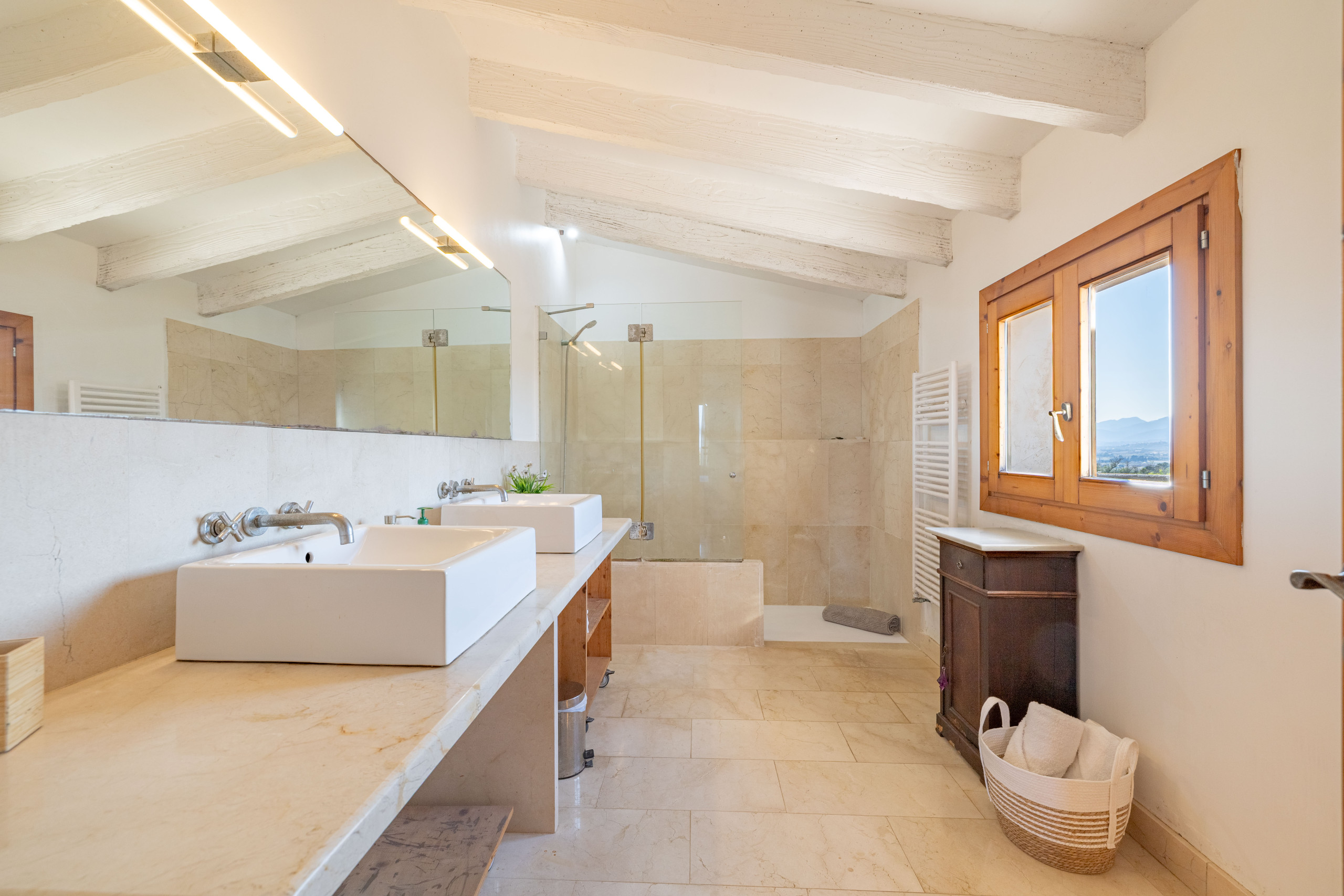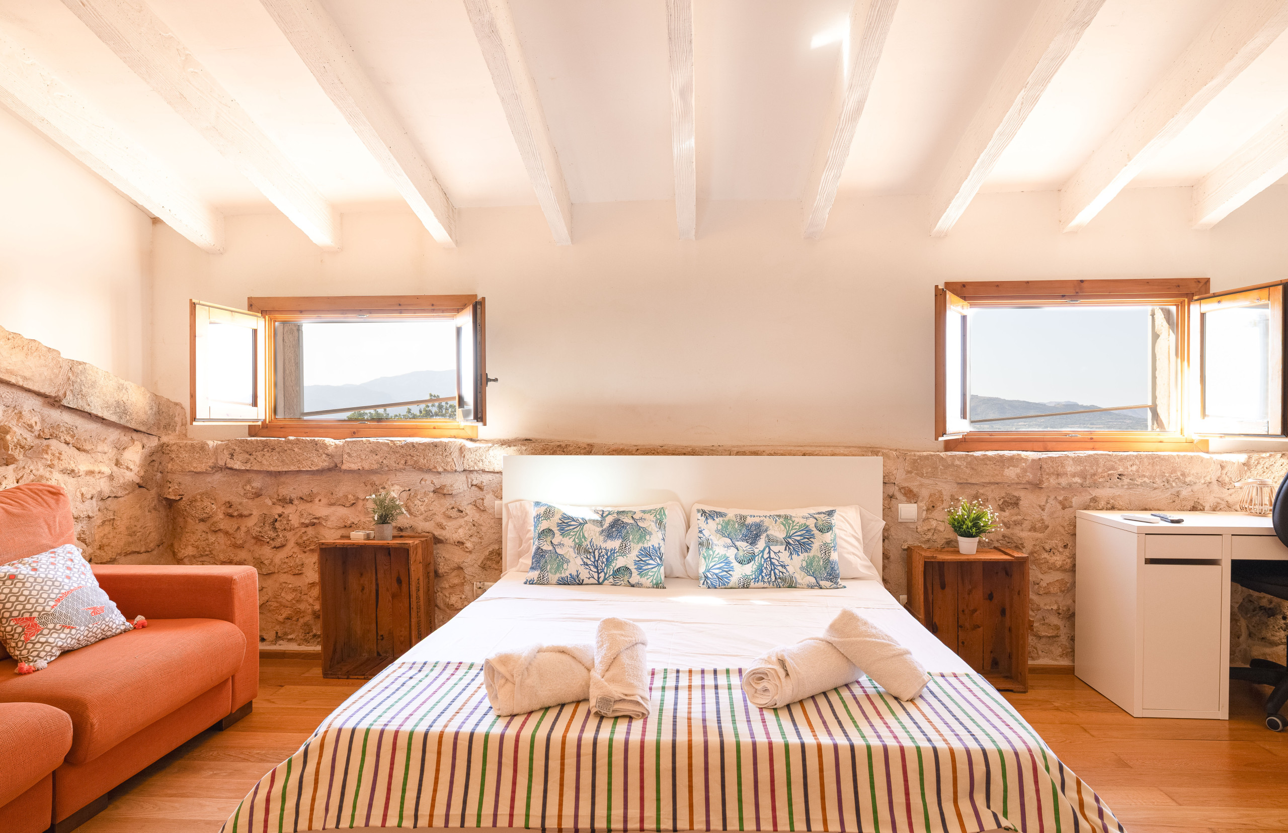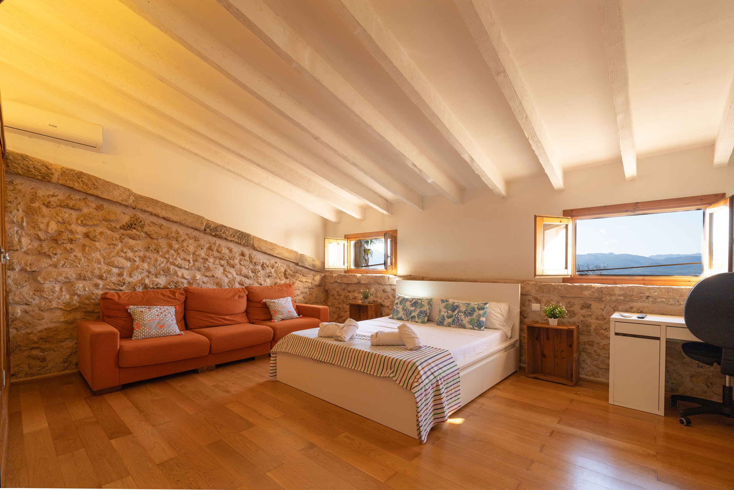 Con vistas al mar Balear, la casa de vacaciones Es Fiters en Muro es perfecta para unas vacaciones relajantes. La propiedad de dos plantas consta de una sala de estar, una cocina bien equipada, cuatro dormitorios y cuatro baños, por lo que puede alojar hasta ocho personas. Los servicios adicionales incluyen Wi-Fi, televisión, aire acondicionado en los dormitorios, lavadora y secadora. También hay una cuna disponible para los huéspedes que la necesiten. El establecimiento ofrece un espacio privado al aire libre que incluye piscina, terraza descubierta, terraza cubierta, balcón y zona de barbacoa. Entre los lugares recomendados para visitar se encuentran la playa de Muro y el Parque Natural de la Albufera. Hay cuatro plazas de aparcamiento disponibles en la propiedad. Se permite un máximo de dos mascotas. No se permite fumar ni celebrar eventos. Esta propiedad cuenta con directrices para ayudar a los huéspedes con la correcta separación de residuos. Además, dispone de características para el ahorro de luz y agua. Parte de la electricidad de la propiedad se genera mediante paneles fotovoltaicos y se han utilizado materiales sostenibles en su aislamiento. Número máximo de mascotas: 2.