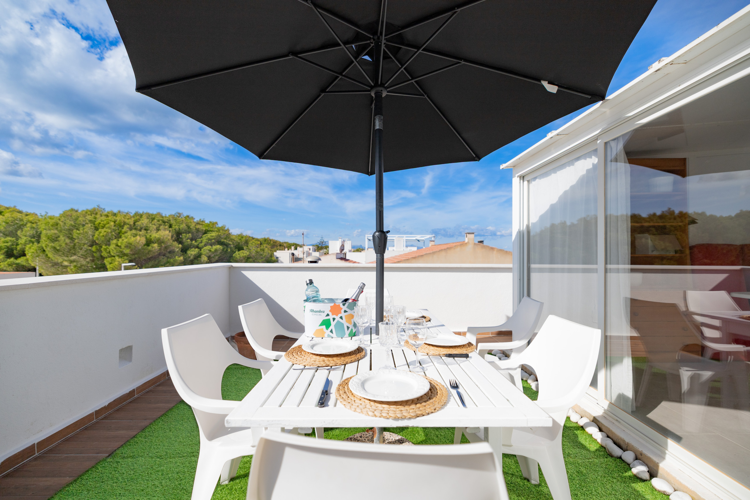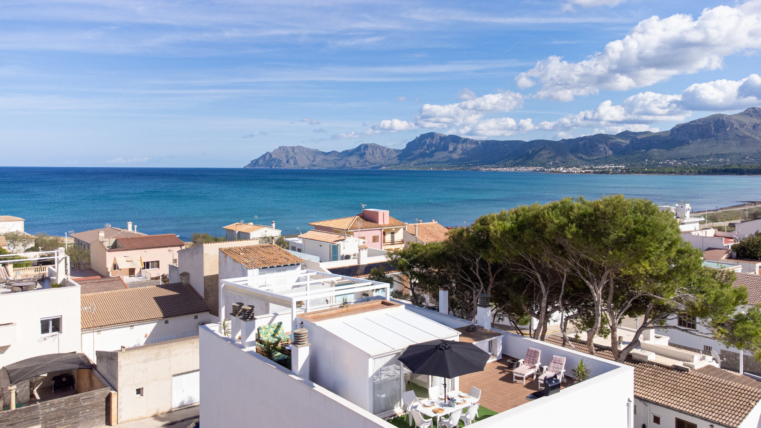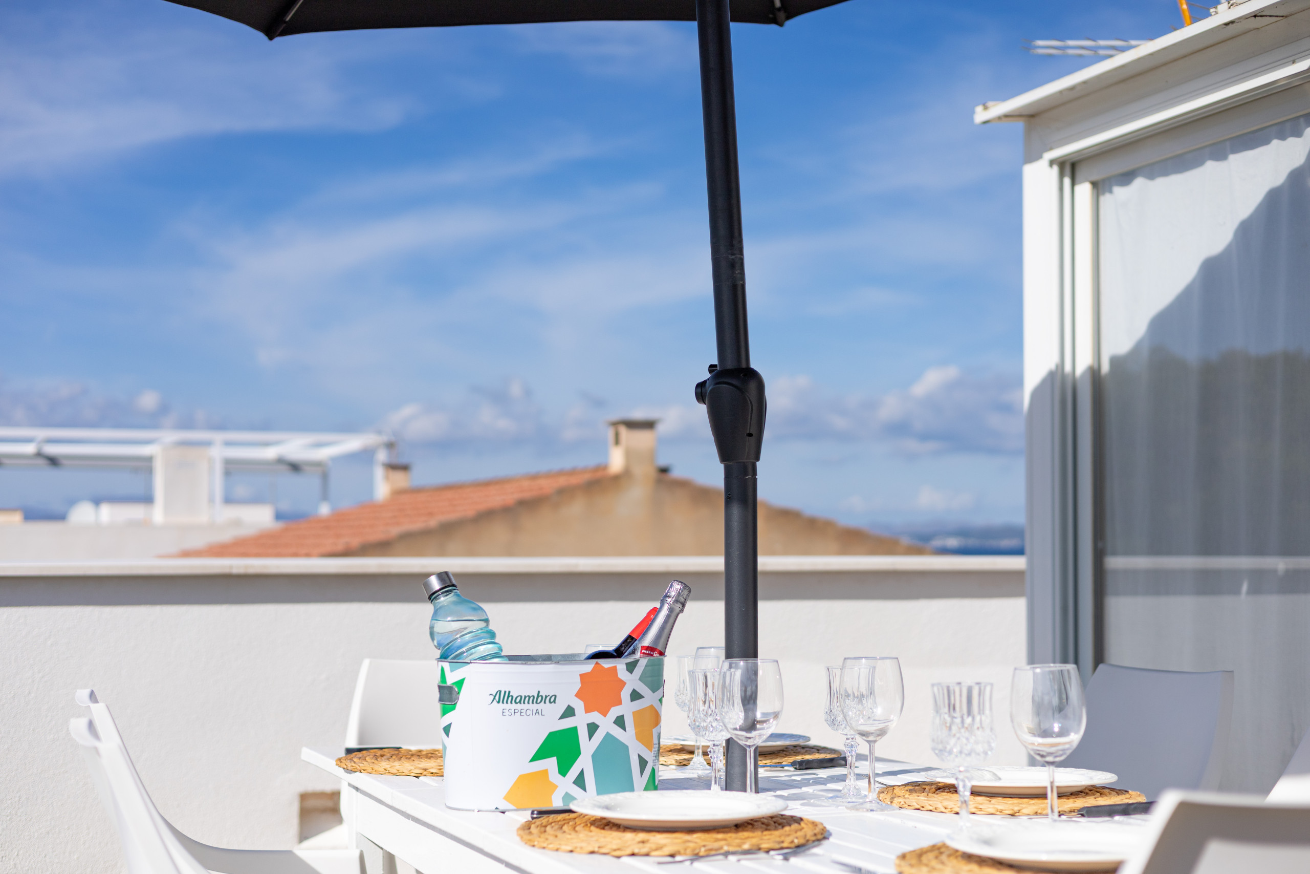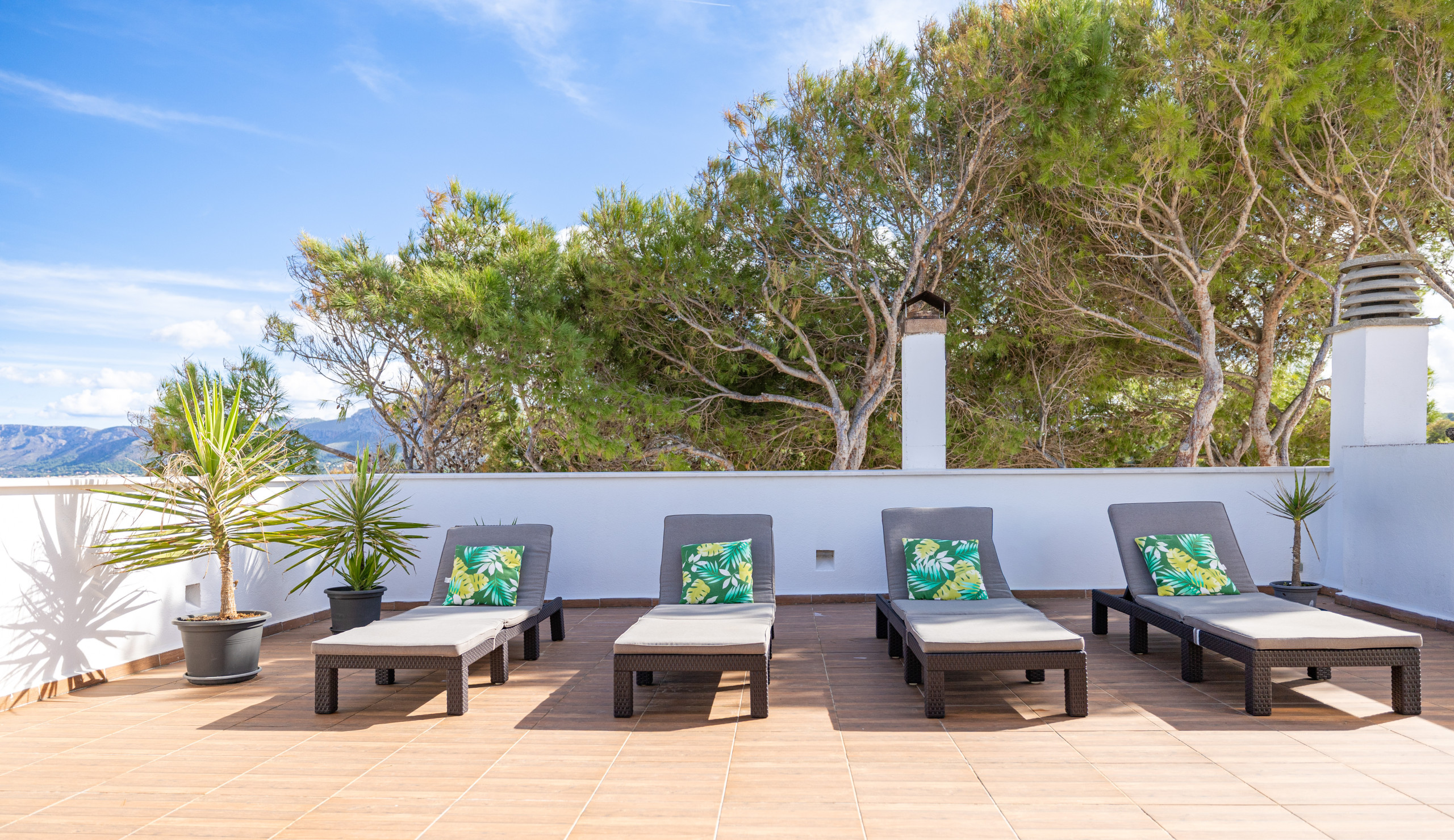 Im Obergeschoss erwartet Sie eine große Terrasse mit überdachtem Bereich, einer gemütlichen Chill-out-Zone und Liegen, ideal zum Entspannen unter der mediterranen Sonne. Hier können Sie auch den Grill nutzen – perfekt, um köstliche Gerichte zuzubereiten und Ihre Familie oder Freunde an warmen Sommerabenden unter dem Sternenhimmel zu begeistern.