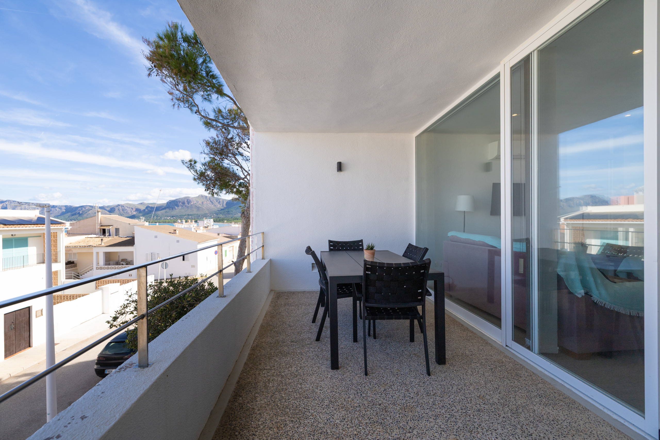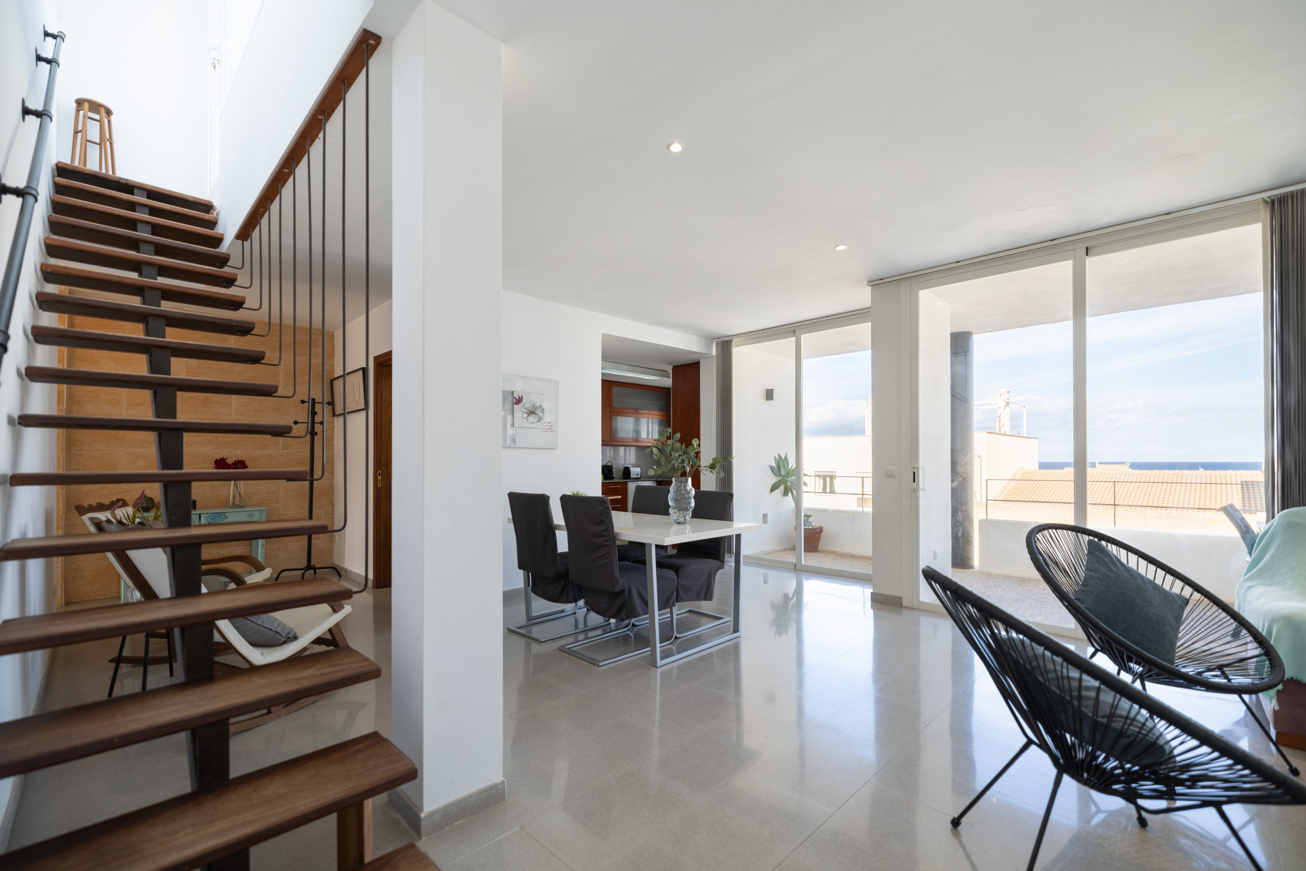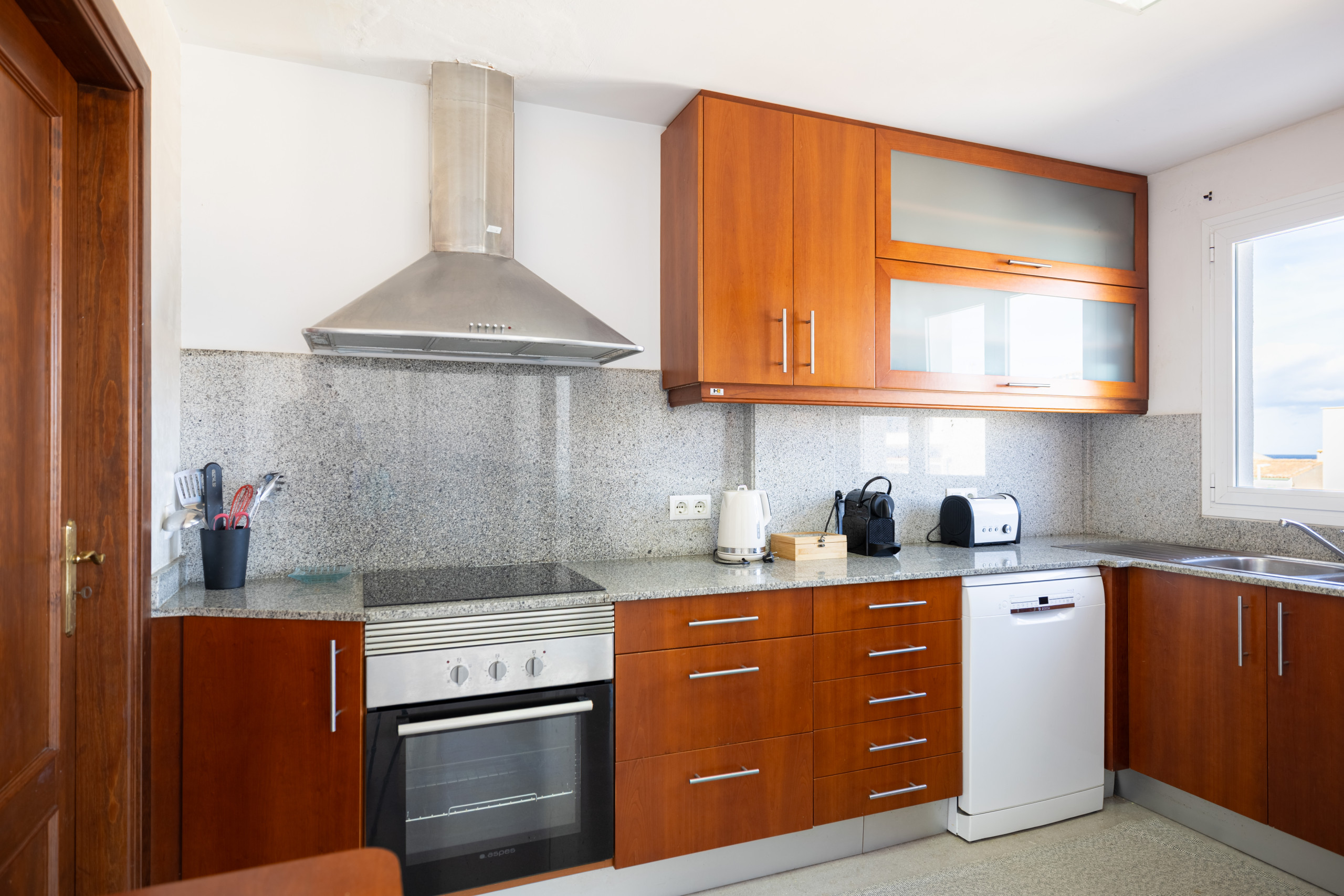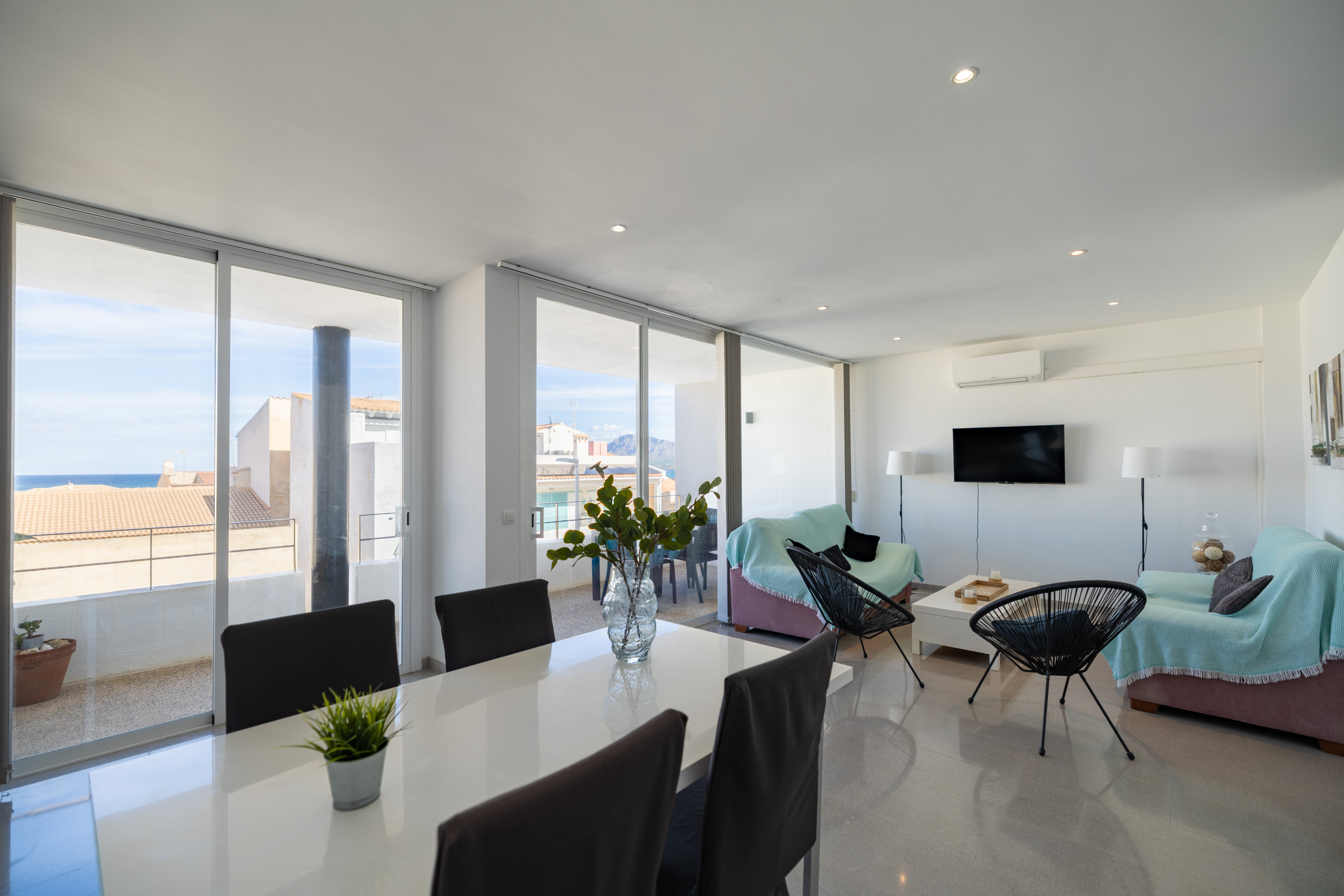 Die offene Küche geht in das helle Wohnzimmer über und ist mit Geschirrspüler, Mikrowelle, Toaster, Wasserkocher und allen notwendigen Utensilien ausgestattet. Durch den Balkon fällt viel Tageslicht, von dem aus Sie teilweisen Meerblick genießen können. Auf dieser Etage finden Sie außerdem ein komplettes Badezimmer und ein zusätzliches WC.