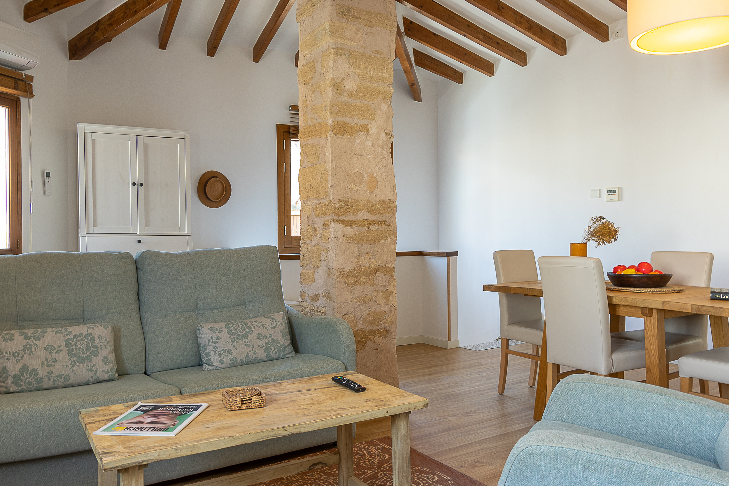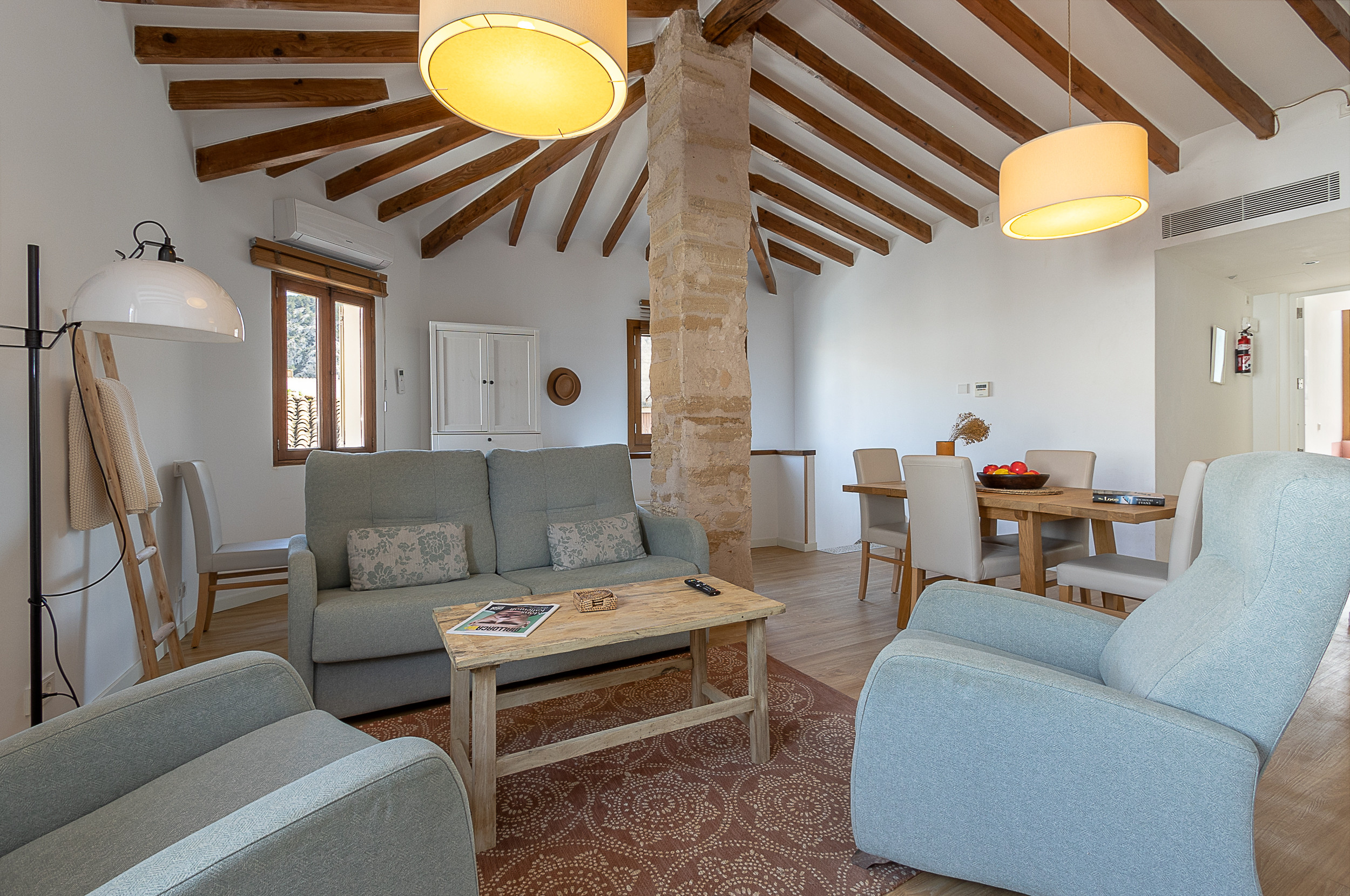 The house is on the first floor by stairs, it has a double bedroom with air conditioning, a spacious and bright living room with cozy reclining chairs and a sofa, a full kitchen, dining table, work desk and air conditioning. The high wood beams and stone pillar are original to the historic house. You'll find a modern bathroom with a Hansgrohe 25 cm rain shower head situated between the living room and bedroom.